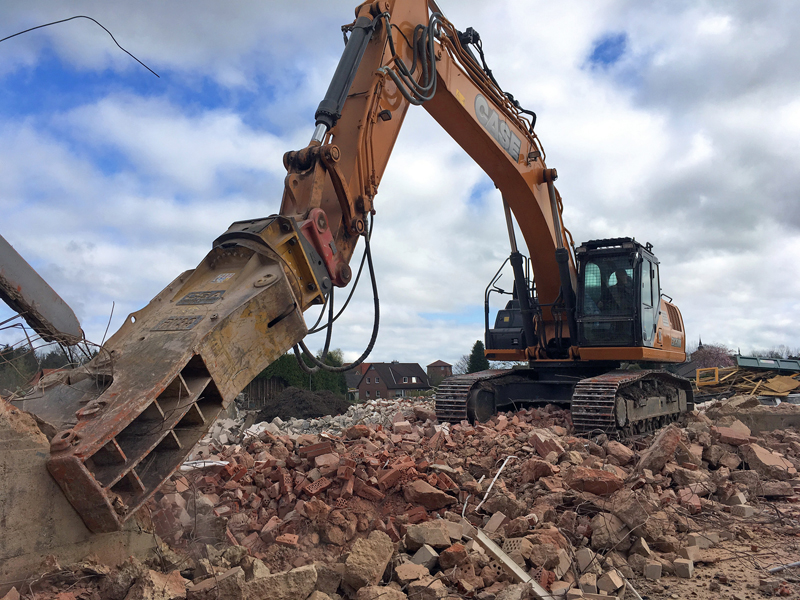 Es wird behauptet, dass man mit dem richtigen Werkzeug so gut wie jede Aufgabe erledigen kann. Thomas Ihler von der Wibrek GmbH & Co. KG kann das aus seiner Sicht voll bestätigen. Mit einem Seitenblick auf seinen Bagger meint er dann: „Ein paar zusätzliche PS können aber auch nicht schaden. Es muss eben alles zusammenpassen, wenn man es mit wirklich harten Brocken zu tun bekommt.“ Und davon gibt es zurzeit auf dem 24 Hektar großen Gelände einer ehemaligen Bundeswehrkaserne eine Menge. Thomas Ihler ist dort im Auftrag bekannten norddeutschen Abbruch- und Recyclingspezialisten damit beschäftigt, die letzten baulichen Hinterlassenschaften einer seit 2006 geräumten Bundeswehreinrichtung zu beseitigen. In der Folgenutzung soll hier später ein komplett neuer Stadtteil mit allen wichtigen kommunalen Funktionen entstehen.