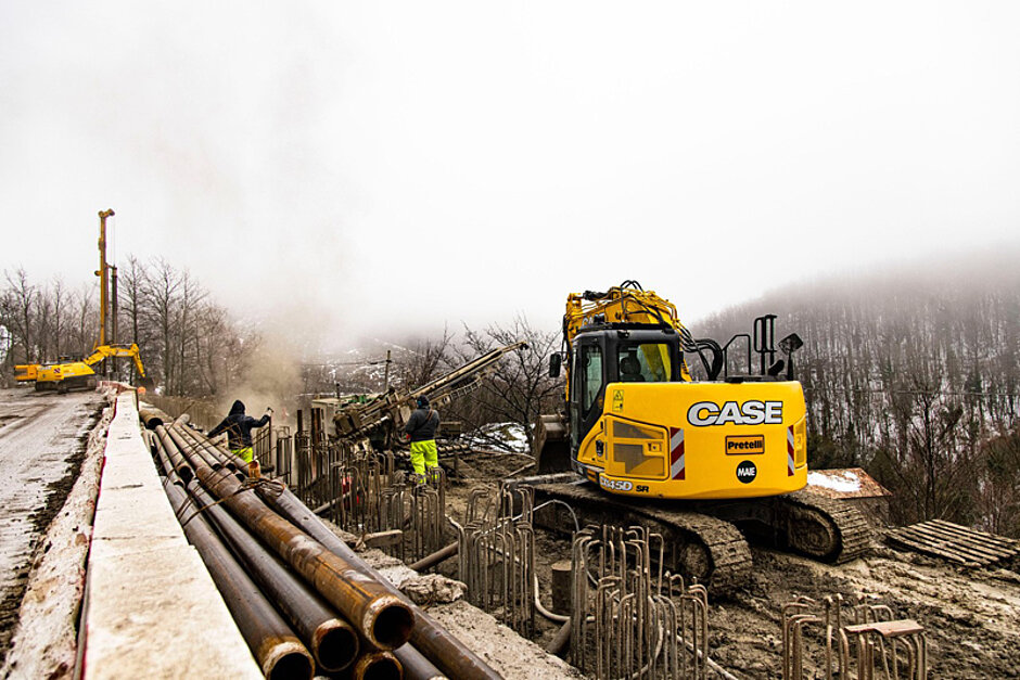 Die zweite Maschine am Einsatzort ist der CX145DSR, ein kompakter Bagger mit kurzem Heck-Radius, der bei der Errichtung von passiven Zugstangen, die eine weitere wichtige Phase dieses Projekts darstellen, zum Einsatz kommt. „Die Maschine zeichnet sich durch eine sehr geringe Aufstellfläche sowie eine hervorragende Leistung aus, die einer herkömmlichen Maschine in der Tonnageklasse 13 bis 18 Tonnen entspricht“, erklärt Francesco Pretelli. „Sie kann sich extrem gut in engen Umgebungen und auf kleinem Raum bewegen. Wir nutzen sie auch für den Transport von Mikropfählen aus hochfestem Stahl, Stahlbeton und Mörtel.“