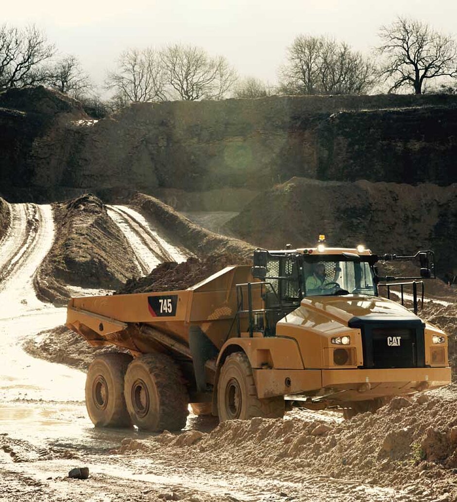 Das kompakte Cat Lastschaltgetriebe und der permanente Allradantrieb verleihen dem 745 eine herausragende Geländegängigkeit bei jeder Witterung. Hinzu kommt die automatische Dauerbremsfunktion, die ohne jeden Fahrereingriff selbsttätig die Bremswirkungen des Dieselmotors, des gewählten Getriebeganges und der Betriebsbremse optimal miteinander kombiniert. Der Berganfahr-Assistent erleichtert das sichere Stoppen und Starten des Muldenkippers an Steigungen. Bei kurzen Pausen im Arbeitsablauf empfiehlt es sich, mit der praktischen Taste auf dem Steuerhebel das Wartebremssystem einzuschalten, das die Betriebsbremse vorübergehend anlegt.