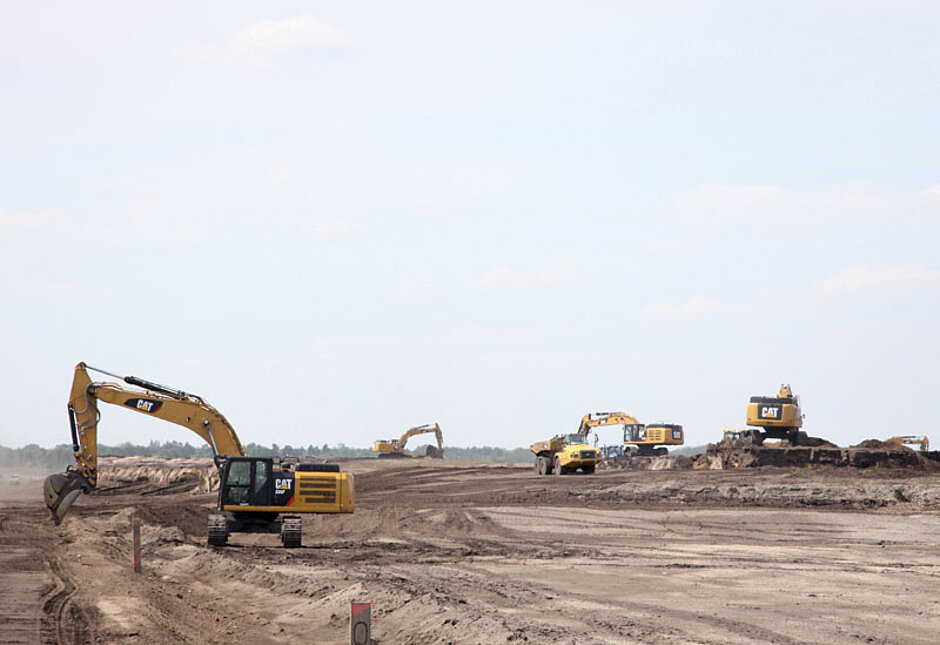Vor Ort ist nicht nur eine riesige Flotte an Baumaschinen in der Massenbewegung gefordert, es bedarf auch einer ausgeklügelten Baustellenlogistik. Sie erbringt die Arge Cottbus Nord, bestehend aus Bickhardt Bau (federführend), Bickhardt Bau Thüringen und V& C Metzner. Ihre Aufgabe ist der Abtrag der Abbausektoren und die Verfüllung der Kohlebahnausfahrt. Dabei greifen sie auf eine Großgeräteflotte an 140 Mietmaschinen zurück, die das Unternehmen Manfred Hoffmann Baumaschinen Industrieservice aus Dorsten/Schwarzheide stellt, darunter zehn Cat-Raupen D8T, 13 Cat-Kettenbagger vom Typ 336 bis 374 sowie fünf Cat-Dumper 730C.