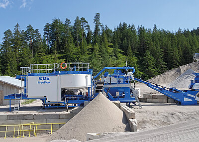 Die Verfügbarkeit von ausreichend Wasser erwies sich als weitere bedeutende Herausforderung am Standort Chauvilly. Die Anlage hat per Wasserfiltrierung vor Ort Zugriff auf 2 600 m³. Die Waschanlage benötigt mit 25 m³/h nur eine geringe Menge Frischwasser. »Eine hocheffiziente Wasserwirtschaft war entscheidend für unseren Betrieb«, betont Jérôme Pélichet. Das System beinhaltet einen Aquacycle-Eindicker, der ein Flockungsmittel verwendet, um sauberes Wasser von Feststoffteilchen zu trennen.