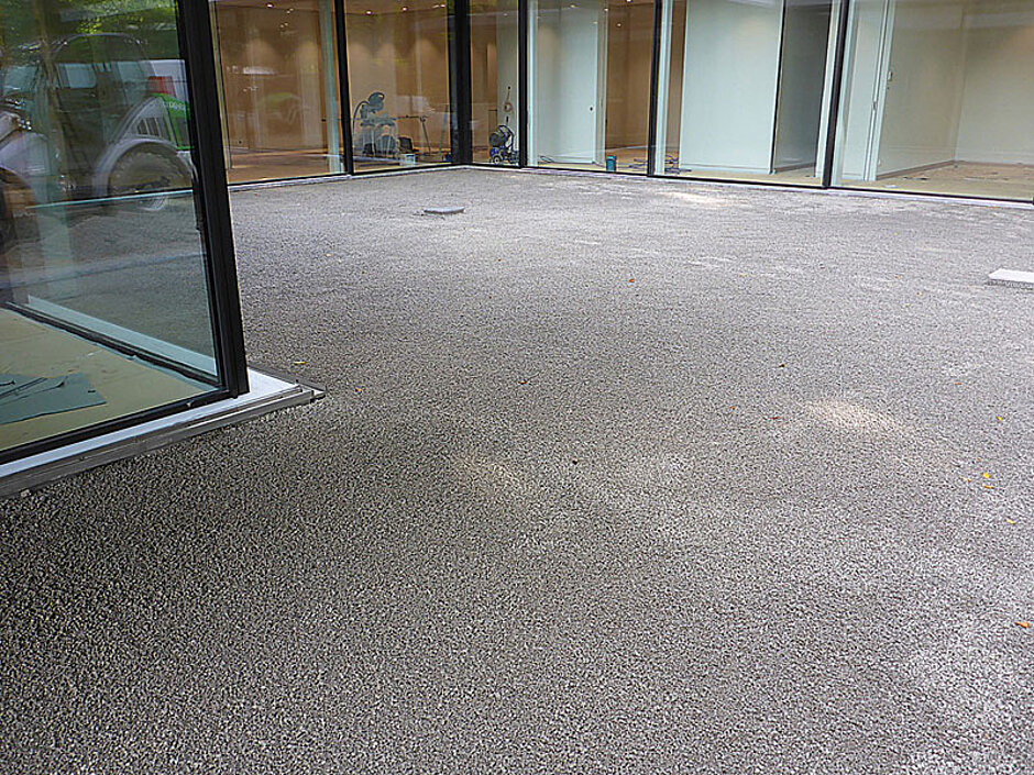 Rund 45 m³ des haufwerksporigen Betons produzierten die Mitarbeiter des Transportbetonwerks Hamburg-Billbrook für die Baustelle, wo das Unternehmen Bahl Garten-, Landschafts- und Schwimmteichbau aus Kiebitzreihe den Einbau übernahm. Unmittelbar auf der Tiefgaragendecke legte die Fachfirma ein dränierendes System aus Folien und einem Abfluss an. Darauf kam eine 20 cm dicke Schicht aus Pervia Classic als Bettungsmaterial, in das dann die Pflasterung gesetzt werden konnte.