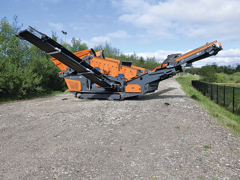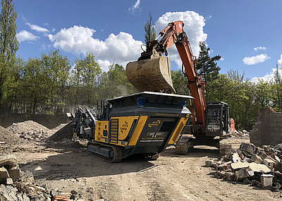 Die 800 mm breiten Seitenbänder mit Abwurfhöhen von bis zu ca. 3 800 mm werden ebenso wie das 1 000 mm breite Überkornband vom 74 PS starken Deutz-Dieselmotor angetrieben. Dabei fördert das unter dem Sieb verlaufende Sammelband die Feinfraktion nicht zum Trichter, sondern zum Siebende ab. Hierdurch bleiben beide Trichterlängsseiten für die Radladerbeschickung und für Wartungsarbeiten zugänglich. Mit 21 t Einsatzgewicht bei Abmaßen von 3 000 mm Höhe, 2 550 mm Breite und 10 680 mm Länge ist die Maschine für den deutschen Markt transportoptimiert.
