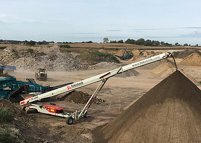 Wie komfortabel bis zu 400 t/h auf maximal 10 000 mm aufgehaldet werden können, zeigt das kettenmobile Haldenband TC 424X von Telestack. Rund zehn Jahre nach Markteinführung der kettenmobilen Haldenbänder durch Christophel sind Telestack-Bänder heutzutage hinter Sieb- und Brechanlagen kaum wegzudenken.