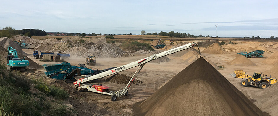Gegenwärtig ist die Frank Albert Spedition + Baustoffe GmbH & Co.KG ein etwa 50 Mann starker Betrieb, der mit großem Fuhr- und Gerätepark in einem Umkreis von gut 100 Kilometern um den Firmensitz tätig ist. Rund 600.000 Tonnen Sand, Recyclingmaterial und Tragschichten werden jährlich aufbereitet und geliefert. Das Spektrum an dafür notwendiger Aufbereitungstechnik ist somit deutlich größer geworden, als es vor 25 Jahren noch war ! Frank Albert betreibt mittlerweile einen ganze Liste mobiler Technik : 1 Powerscreen Warrior 1800, 2 Powerscreen Chieftain 1400, 4 Telestack Haldenbänder TC421 + 421R, eine mobile Powerscreen XR400S Brechanlage, einen raupenmobilen Windsichter AirCrawler 1600, sowie 2 zuletzt gelieferte Powerscreen Warrior 2100 gehören heute zum umfangreichen Maschinenpark.