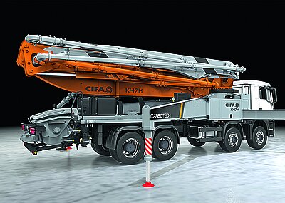 Das Modell K67H feierte in München Premiere und erweitert mit einer 67-m-Autobetonpumpe die Cifa-Carbotech-Reihe nach oben. Bei der Neuheit handelt es sich nach Anbieterangaben um die längste Maschine im Markt auf einem sechsachsigen Fahrgestell. Sie verfügt über ein siebenteiliges Armpaket mit RRZ-Faltung, die die Vorteile eines leichten R-Falters mit der Flexibilität der Z-Faltung kombiniert. Die letzten vier Abschnitte bestehen aus dem Cifa-eigenen CFK-Verbundwerkstoff Carbotech, der dank seiner Leichtig- und Festigkeit eine höhere Stabilität und Länge zum niedrigen Gesamtgewicht von unter 60 t beiträgt. Die umfangreiche Serienausstattung des Modells beinhaltet – für die Carbotech-Serie typisch – das Maschinen-Managementsystem Smartronic Gold mit Stabilitätskontrolle ASC (Advanced Stability Control) sowie Fehlerdiagnose- und neue elektronische Funktionen zur Erleichterung der Bedienung auf der Baustelle. Es zeichnet sich auch durch doppelwandige, von Cifa Long-Life-Top genannte Verrohrungen aus, die hohe V