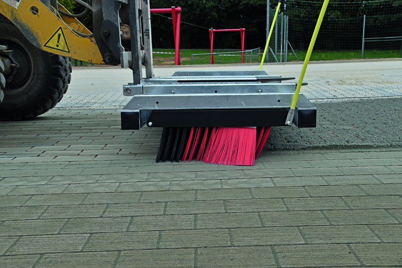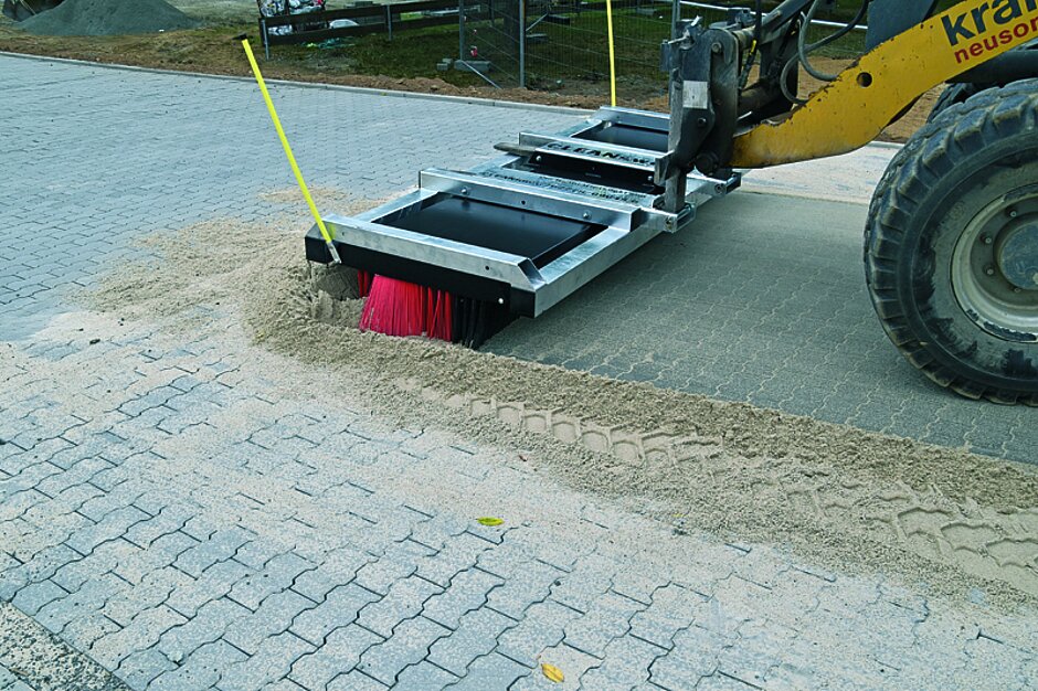 Sand, Kies oder Schotter wird beim Cleansweep-V-Concept mit einer Ladeschaufel breitflächig verteilt und anschließend wie mit einem normalen Straßenbesen eingekehrt – jedoch im »XXL«-Format. Das Unternehmen Cleanline Reinigungstechnik bietet für vielfältige Einsatzgebiete verschiedene Breiten von schmalen 1,5 m für Gehwege bis zu stattlichen 4,8 m an. Dank einer unkomplizierten Befestigung ist der Cleanline-Besen schnell angebaut – häufig ohne dabei vom Trägerfahrzeug absteigen zu müssen.