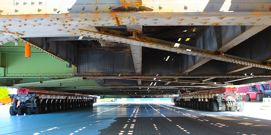 Über den Nord-Ostsee Kanal wird die Brücke auf einer Barge nach Lubmin geschleppt. Dort angekommen fährt das 1.000 Tonnen schwere Element mit 36 selbstangetriebenen modularen Achslinien Cometto SPMT und zwei Power-Pack-Einheiten mit einer Antriebskraft von je 202 kW von der Barge herunter.