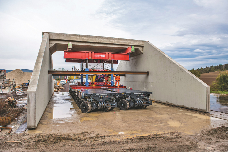 Markus Meckelholt positionierte die Brücke dank Hub und Präzisionslenkung millimetergenau über die Endposition. Hier mussten erst noch die Aussparungen freigestemmt werden, ehe die Brücke über die Eisenköcher auf den Betonfundamenten hinabgelassen werden konnte. Mit einer Traglast von 60 t soll das Bauwerk auf Jahrzehnte hinaus eine sichere Überfahrt ermöglichen. Für Markus Meckelholt stand die nächste Mission bereits unmittelbar bevor. »Da warten dann sogar mehrere Brückenelemente bei einem Projekt nahe Köln. Und das Zeitfenster ist noch kleiner.« tü t