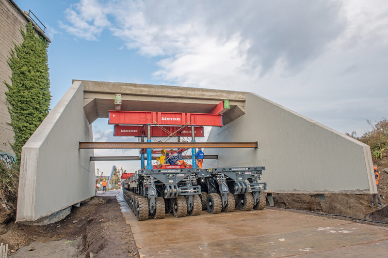 In den Tagen vor der Verschiebung hatte das Team von Autokrane Schares aus Bocholt, Essen, Goch und Willich eine Side-by-Side-Kombination von Cometto mit insgesamt 24 Achslinien zusammengebaut. Darauf ragte ein Hubgerüst, das für die Brückenaufnahme installiert wurde. Sechs Jahre arbeitet Markus Meckelholt bereits für Schares, bisher im klassischen Schwertransport. Doch mittlerweile hat ihn die Leidenschaft für die Selbstfahrerprojekte gepackt, die Tücken der anstehenden Aufgabe waren ihm deutlich bewusst: »Das leichte Gefälle muss ich stets mit dem SPMT ausgleichen. Daher mein Motto: ganz einfach schön langsam fahren und alles im Auge behalten.«