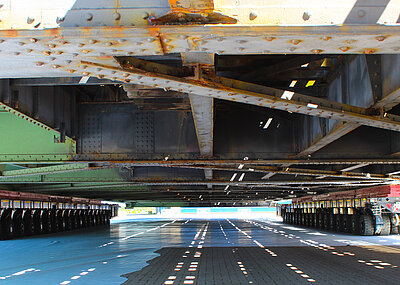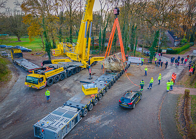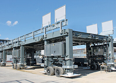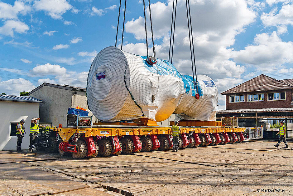 Um den Weg zum Montageplatz hinter sich zu bringen, war ein Zusammenspiel verschiedener Hub- und Fahrgeräte nötig. Aufgrund der notwendigen Ausladung über ein Gebäude hinweg kamen zunächst zwei Raupenkrane zum Einsatz: Von Wiesbauer selbst ein Demag CC 2800 und Krandienstleister Neeb stellte einen Liebherr LR 1600. Im Tandemhub wurden die Bauteile mit Augenmaß aus dem Schiff und über eine Lagerhalle hinweg gehoben. Im Anschluss setzten beide Raupenkrane synchron zur Rückwärtsfahrt auf den ausgelegten Matten an, was den Cometto SPMT Selbstfahrer auf den Plan rief. Joachim Kolb unterstreicht den Teamgedanken bei diesem Projekt: »Wiesbauer verstärkt sich bei diesem cross-hire-rental-Einsatz mit Achslinien aus dem Fuhrpark der Schares Autokrane GmbH.« Insgesamt bauten die Experten eine side-by-side-Kombination mit 2 x 12 Achslinien zusammen. Angetrieben wurde das Ganze von zwei Power Pack Einheiten mit einer Leistung von 129 kW und 202 kW.d