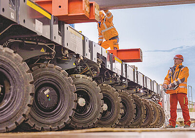 "Mit der elektronischen Lenkung dieser Fahrzeuge lässt sich so ein Bauwerk auf den Millimeter positionieren", berichtet Joachim Kolb, Sales Manager von Cometto, über die eingesetzte Technologie bei solcher einer Präzisionsaufgabe. "Das machet der Fahrer mühelos und super exakt über die Fernbedienung."
