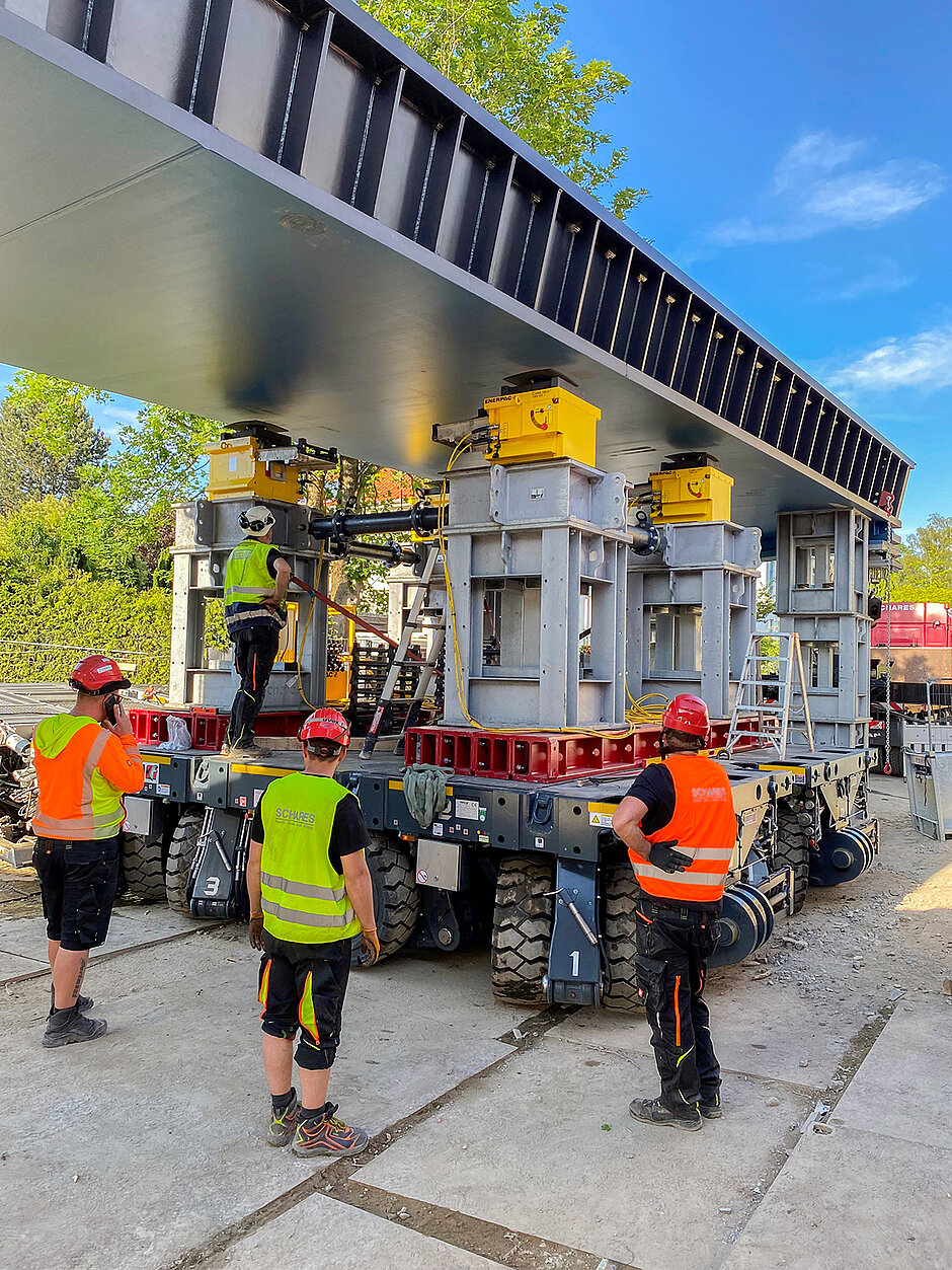 Als vom Bediener am Theodolit die Meldung "Bauteil in korrekter Position" gekommen ist, senkt sich der SPMT ab und legt die Brücke auf deren Auflagen ab.