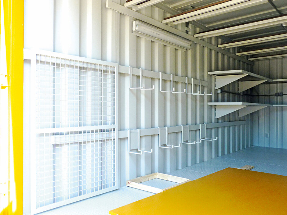 Beim Blick auf die griffbereiten Werkzeuge im Container denken viele direkt an die Einbruchsicherheit. Diezemann verweist auf eine massive Stahlplatte: »Dank ausgeklügeltem Schienensystem kann diese vor der Tür platziert werden und dient praktischerweise auch noch als Auffahrrampe. Da braucht es einen Brennschneider, um durch zu kommen, und der ist in der Regel ja innerhalb des Lager-Containers.«