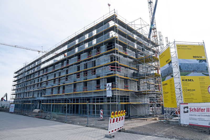 Mit Blick auf das Gesamtprojekt ist das Coreum längst nicht vollendet: Abseits des Veranstaltungsgeländes herrscht in Stockstadt reger Baubetrieb. Direkt gegenüber des Haupteingangs entsteht ein mehrstöckiges Hotel. »Aktuell rechnen wir mit der Fertigstellung zum Jahresende«, so Kathrin Kiesel. Die ersten beiden Etagen standen zum Zeitpunkt der Veranstaltung bereits – drei weitere sollen noch folgen. Die Gäste können somit in Zukunft zu Fuß zwischen Veranstaltung und Hotel wechseln und müssen keine hektischen An- und Abfahrtszeiten mehr berücksichtigen – insbesondere wenn sie von weit außerhalb anreisen müssen. Weiteres Wachstum verspricht sich die Coreum-Geschäftsleitung auch durch die angebotenen Trainings. Große Werkstätten, das weitläufige Außengelände sowie integrierte Showrooms, ein Restaurant und Besprechungsräume ermöglichen eine Vielzahl verschiedener Aktivitäten.