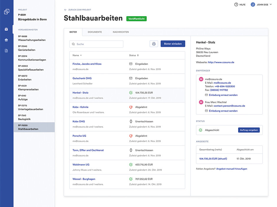 Die Cosuno-Software digitalisiert die Prozesse bereits vor Baubeginn. Nutzer erhalten Zugang zu einer Datenbank mit qualifizierten Nachunternehmen. Diese werden zur Angebotsabgabe aufgerufen und automatisiert – bequem für beide Seiten. Ein weiteres Ergebnis, das Einkäufer Paul schätzt: Der Auftritt seiner Firma gegenüber den Nachunternehmen ist jetzt einheitlich. »Das wirkt professioneller als der bisherige Kontakt«, sagt der Praktiker. Die angeschriebenen Firmen können per Klick absagen – und der Bauträger dann gegebenenfalls rasch ein weiteres Unternehmen kontaktieren. Diese Reaktionsmöglichkeiten bringen Tempo in den Prozess. Die Angebote erhält Andreas Paul immer noch häufig per Fax und mit der Hand geschrieben. »Für uns ist wichtig, dass wir die Verwaltung auch dieser Firmen digital erledigen können«, sagt er.