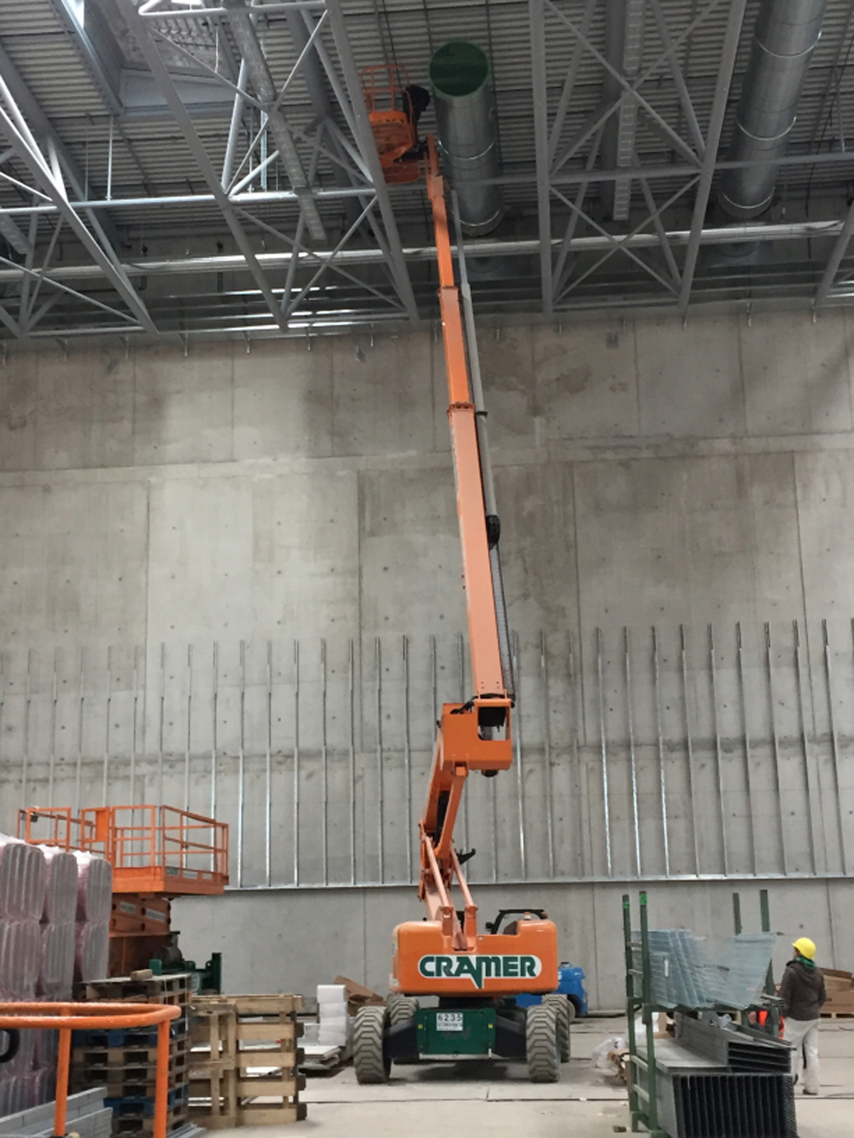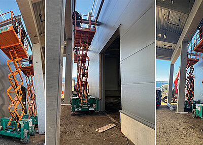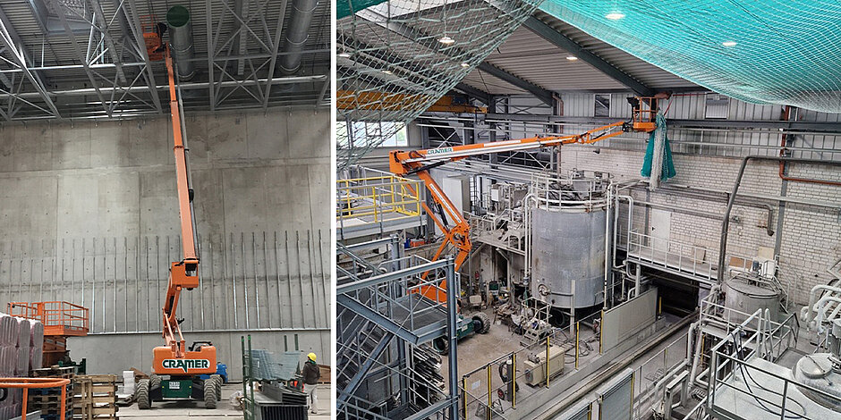 Aufgrund des geringen Platzangebots in der Halle war es nicht möglich, um zu fahren oder zu wenden, sodass die Netzer ihre Arbeiten von einer Position aus durchführen mussten. Hierfür wurde die volle Reichweite der Bühne von 18,90 m benötigt. So konnte die herausfordernde Aufgabe gemeistert und ein sicheres Arbeitsumfeld für die Stahlbauer geschaffen werden.