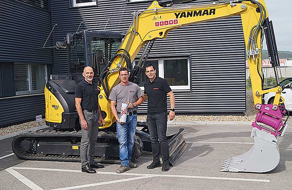 Flicker Erdbau aus Waidhofen verstärkt seine Flotte um einen Yanmar-Kompaktbagger Vio57-6A. René Flicker hat das Gerät persönlich bei Cramo in Wiener Neudorf übernommen. Goran Dimitrov, zuständig für den Verkauf von Yanmar-Neumaschinen bei Cramo, gratulierte dem Käufer, mit dem Gerät die richtige Entscheidung getroffen zu haben. Der Vio57 ist ein Kompaktgerät der 6-t-Klasse. Mit dem Nullheckbagger kann auch auf engen Baustellen leicht gearbeitet werden. Ausgestattet ist er mit einem XtraTilt-Schwenkmotor von Winkelbauer und Anbauwerkzeugen. §