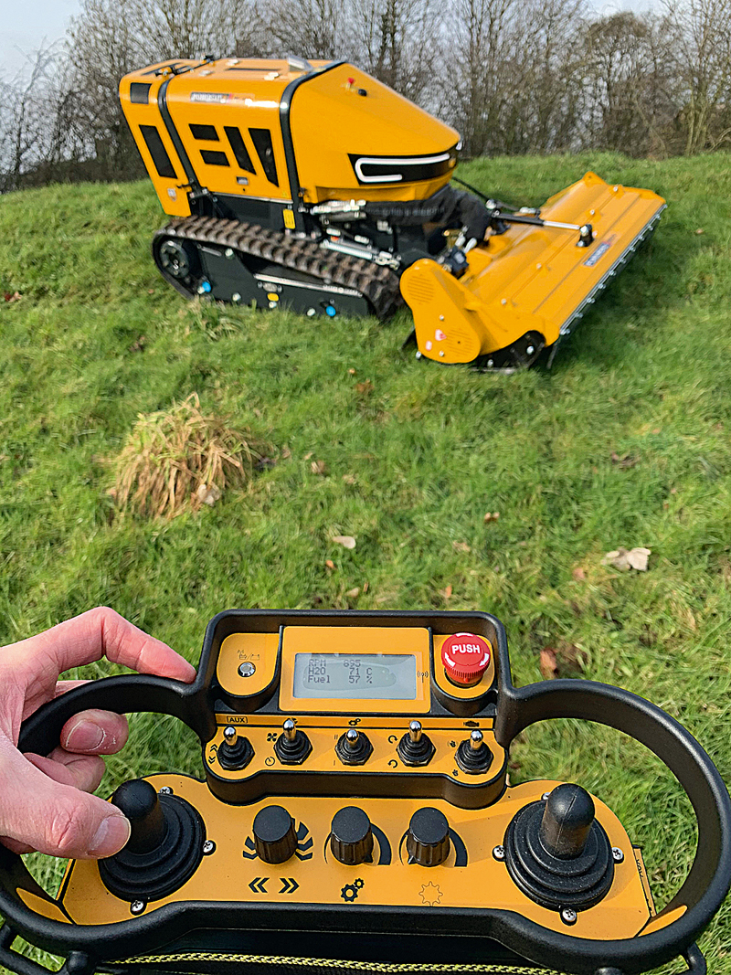 Doppelte Überrollschutzbügel und eine vollständig geschlossene Ganzmetallkarosserie sollen nicht nur das Eindringen von Staub und Schmutz verhindern, sondern auch bei Arbeiten unter rauen Bedingungen für hervorragenden Schutz und eine Langlebigkeit der Maschine sorgen. Die Hetronic-Handfernsteuerung unterstützt eine intuitive Bedienung des Robocut2 RC40. Die Arbeitsreichweite beträgt damit bis zu 150 m. Zwei Joysticks ermöglichen die Steuerung von Bewegung, Lenkung und Anbaugeräten, während weitere Funktionen für Getriebe, Rotordrehzahl, Geschwindigkeitsstufe, Kühlerselbstreinigung und Not-Aus per Tastendruck abgerufen werden können.