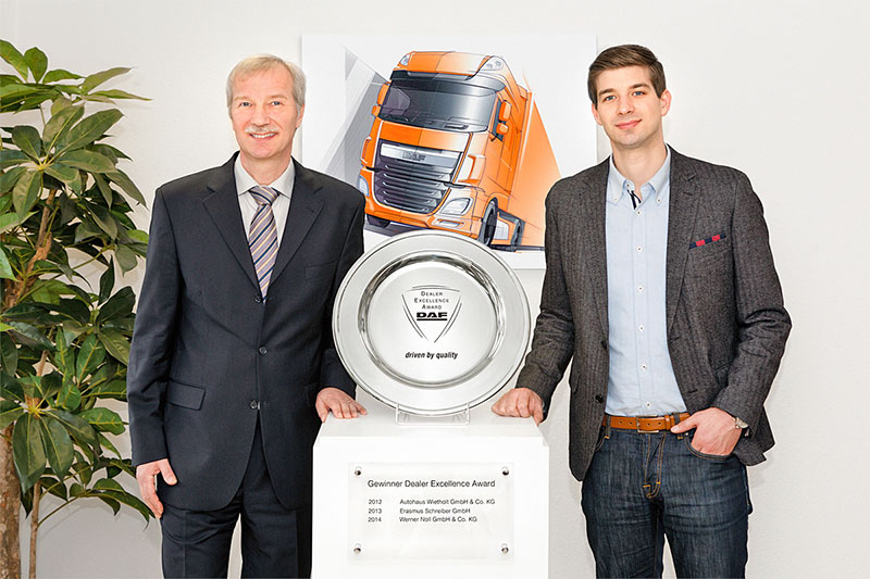Der Sieger für 2014 heißt Werner Noll GmbH & Co KG aus Künzell. Der nahe Fulda an der A7 gelegene Betrieb glänzte bereits in den Jahren zuvor durch hohe Punktzahl und stand immer mit auf dem Siegertreppchen der drei Erstplatzierten. Diesmal hat es für den Sieg gereicht. Neben der Kontinuität auf hohem Niveau konnte Noll die volle Punktzahl bei der Kundenzufriedenheit ergattern. Außerdem hat der DAF-Stützpunkt bei der Personalentwicklung und im Teile-Bereich noch mehr Anstrengungen unternommen und kräftig zulegen können. »Wir freuen uns nach all den Anstrengungen, den Dealer Excellence Award und die Siegerprämie nach Hessen zu holen. Diese Auszeichnung bestätigt unser langjähriges Bestreben, den Kunden stets bestmögliche Qualität zu liefern«, sagte Bernd Frings, Geschäftsführer bei Werner Noll, nach Bekanntgabe des Gewinners. Seine Firma war der einzige DAF-Partner, der auch nach sämtlichen Zwischenauswertungen im vergangenen Jahr nie schlechter als »Platz 3« abschnitt und sich so mit der besten Vertriebs- und Servicequalität auf den ersten Rang vorschieben konnte. Der Händler- und Servicestützpunkt wurde 1966 von Werner Noll als Bremsendienst gegründet. 1973 unterzeichnete der Firmengründer den Vertrag mit DAF, 1991 verkaufte Noll mangels fehlender Nachfolge in der Familie seinen Betrieb an Bernd Frings, der seitdem als alleiniger Geschäftsführer und Gesellschafter fungiert. Unterstützung erhält er durch seine Frau Helga, die die Buchhaltung leitet und durch die beiden Söhne Christian und Thomas, die als Diplom-Kaufmann im Verkauf Innendienst beziehungsweise als Kfz-Meister in der Werkstatt tätig sind.»Aufsteiger des Jahres«