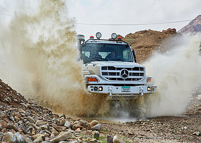 Beide Modelle haben es in sich: Der Actros verfügt über einen 12,8-l-Reihensechszylinder mit 375 kW (510 PS) und ein GigaSpace-Fahrerhaus. Er zieht einen Curtainside-Anhänger. Der 3,5 t schwere Fuso Canter 3C13 wird von einen 3-l-Common-Rail-Turbodiesel mit 96 kW (130 PS) angetrieben.