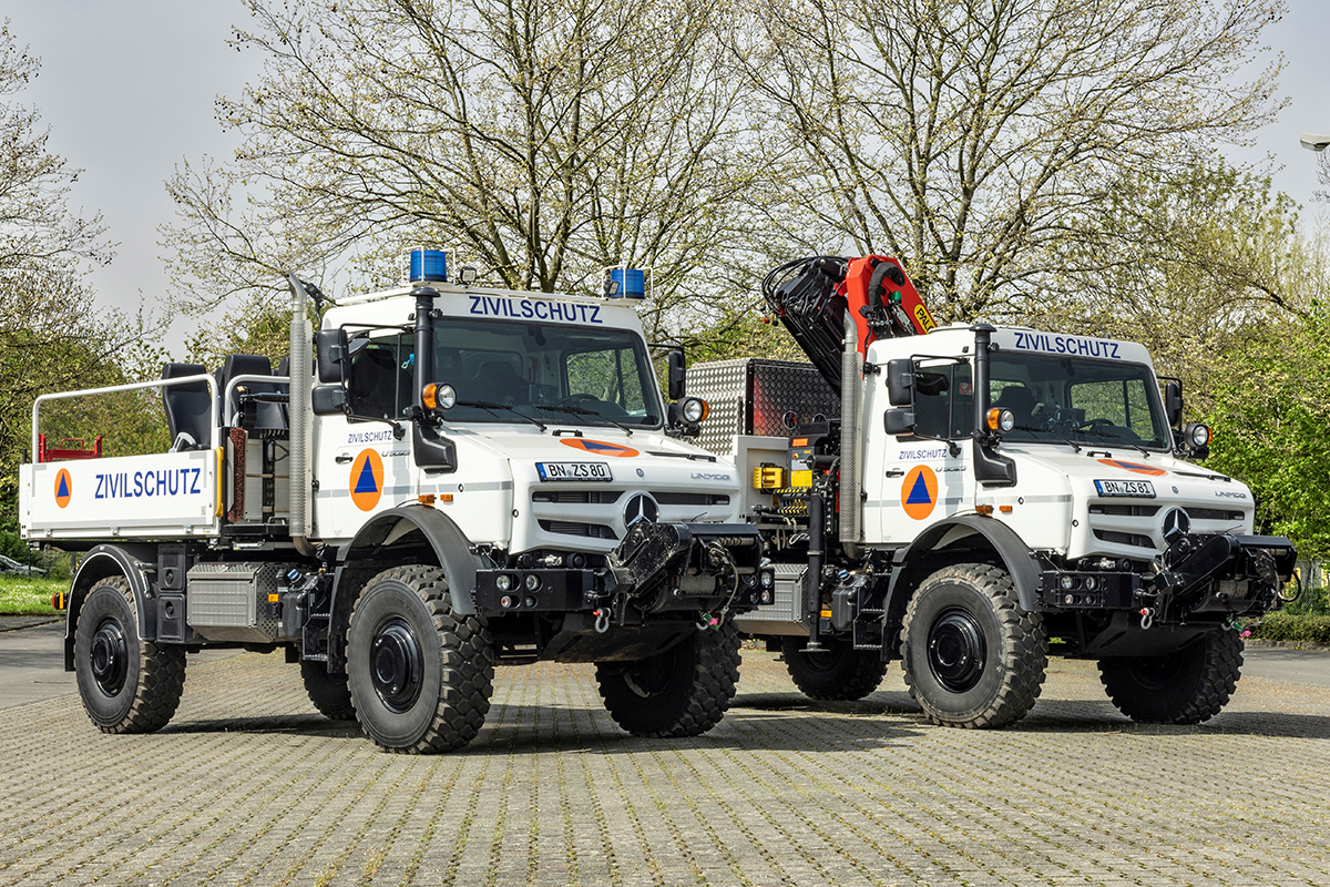 Zu den vorteilhaften Eigenschaften der beiden hochgeländegängigen Unimog zählen neben dem Allradantrieb mit hundertprozentig wirkenden Längs- und Querdifferentialsperren, dem automatisierten Schaltgetriebe mit acht Vorwärts- und sechs Rückwärtsgängen, der hohen Nutzlast sowie den kompakten Dimensionen vor allem die hohe Verwindungsfähigkeit und die Achsverschränkung bis zu 30 Grad. Die Bodenfreiheit von bis zu 50 cm und die kurzen Rahmenüberhänge verleihen den beiden Offroad-Fahrzeugen große Böschungs- und Rampenwinkeln, die das Überwinden von Hindernissen auf dem Weg zum Einsatzort auch in besonders anspruchsvollem Gelände möglich machen.