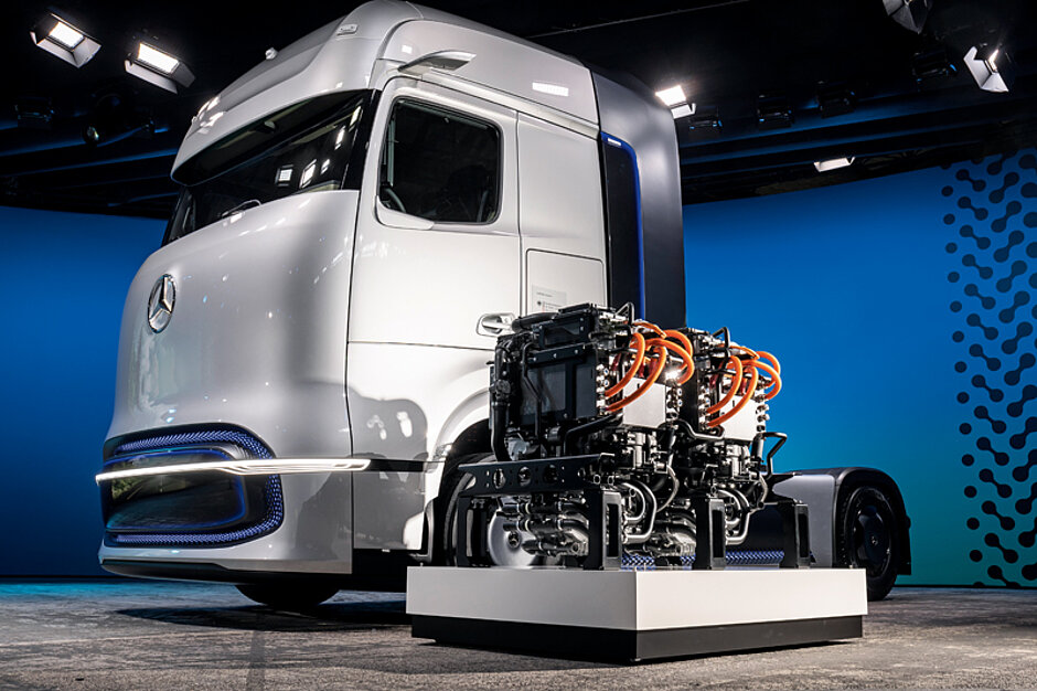 Den Anfang in Sachen Brennstoffzellenantrieb macht der Mercedes-Benz GenH2 Truck, der kürzlich seine Weltpremiere als Konzeptfahrzeug feierte. Mit dem GenH2 Truck will Daimler Trucks erstmals zeigen, welche konkreten Technologien der Hersteller vorantreibt, damit schwere Brennstoffzellen-Lkw flexible und anspruchsvolle Fernverkehrseinsätze mit Reichweiten von bis zu 1 000 km und mehr mit einer Tankfüllung fahren können. Daimler Trucks plant den Beginn der Kundenerprobung des GenH2 Truck für das Jahr 2023, der Serienstart soll in der zweiten Hälfte des Jahrzehnts folgen. Die Leistungsfähigkeit des Fahrzeugs soll dabei dank des Einsatzes von flüssigem anstatt gasförmigem Wasserstoff aufgrund der deutlich höheren Energiedichte gleichauf mit der eines vergleichbaren konventionellen Diesel-Lkw liegen.