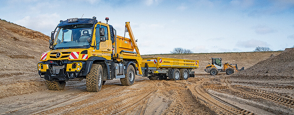 Der Schritt war nicht einfach für ihn, aber er hat sich ein Hintertürchen auf die Insel offengelassen: Zusammen mit seinem Sohn Björn gründete er dort das Unternehmen BK Wegebau. Ein Fachbetrieb für Tief- und Erdbau, GaLaBau sowie Bagger- und Abbrucharbeiten. Auf Föhr gibt’s viel zu tun, die Kohns müssen Schuttmulden an- und abfahren und regelmäßig zur Deponie nach Flensburg übersetzen. Und genau dafür musste ein leistungsstarkes Fahrzeug her, das wendig und individuell einsetzbar und vor allem kurz ist. »Auf der Fähre wird nämlich nach Länge abkassiert«, erklärt Unternehmer Kohn. Dass es schließlich ein Unimog U 427 mit einer Länge von 3,15 m mit kommunaler Anbauplatte und K80-Aufnahme für einen Muldenkipper wurde, ist für die Kohns inzwischen »ganz logisch. Wir kommen damit in jeden Hof, können die Mulden nahezu überall flexibel absetzen.«