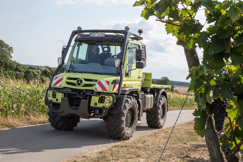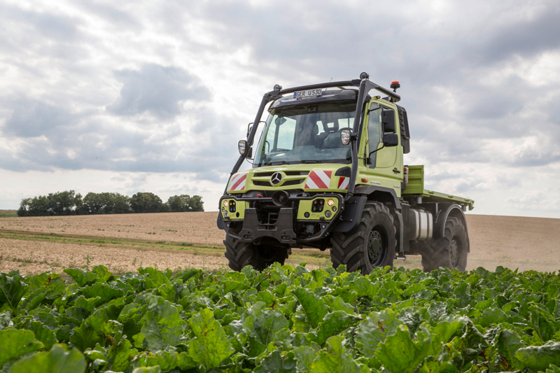 Auf der Messe zeigt Mercedes-Benz zwei schwere Unimog U 530 (16,5 t zulässiges Gesamtgewicht) und einen leichten U 218 (10,0 t zGG), alle in Agrarausführung. Der ausgestellte U 530 mit Traktor–Typenzulassung verfügt dank Sicherheitskabine mit Überrollbügel über eine EU-weite Zulassung. Während in Deutschland die Zulassung als Zugmaschine-Ackerschlepper/Zugmaschine-Geräteträger schon seit längere Zeit möglich ist, kann der Unimog dank der Sicherheitskabine jetzt in der gesamten EU mit Traktor-Typenzulassung geordert werden. Im ausgestellten „U 530 Traktor“ - die 30 steht für rund 300 PS – ist die Spitzenmotorisierung verbaut, ein Sechszylinder-Diesel mit 7,7 Liter Hubraum und 220 kW (299 PS), der die strenge Vorschrift Euro VI d erfüllt.