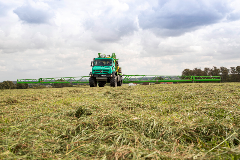 Ein weiteres Plus ist die erlaubte Höchstgeschwindigkeit, denn der Dünger muss mehrfach täglich nachgeladen werden. Genauso wichtig ist die für diesen Einsatz optimierte Anordnung der Kühler, die dem hohen Staubaufkommen bei der Feldarbeit trotzen können. Und damit auf dem Acker nicht zu viel Dünger landet, verfügt der Streuer über modernste Software und Streutechnik, was eine exakte Verteilung der Düngemengen ermöglicht. Zusätzlich ist der Unimog mit einem Stickstoffsensor ausgerüstet, der den Bedarf der Pflanzen messen kann und direkt an den Streuer kommuniziert. So lässt sich nicht nur Düngemittel sparen, auch das Grundwasser wird weniger belastet.