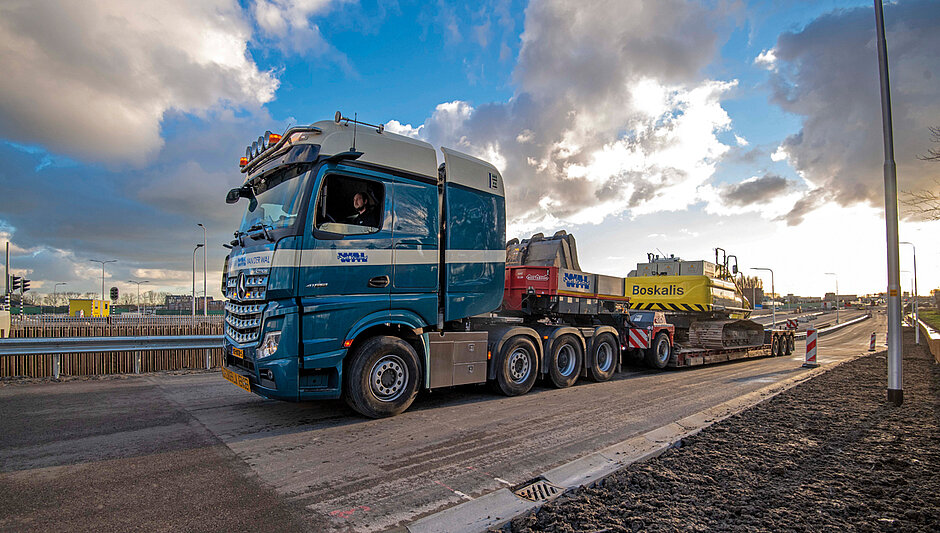 Die spezielle Kupplung des Actros 4163 LS 8x4 SLT und ein zulässiges Gesamtzuggewicht von bis zu 180 t ermöglichen Luijendijk & van der Wal den Transport von sehr schweren Lasten wie beispielsweise Raupenkranen, Zerkleinerungsmaschinen und Siebmaschinen. Vor der Bestellung konnte sich das niederländische Transportunternehmen persönlich von den Fahrzeugeigenschaften überzeugen: Ein Unternehmen aus der gleichen Branche stellte einen bauähnlichen Actros SLT zur Probefahrt bereit und teilte seine Erfahrungswerte aus dem praktischen Einsatz.