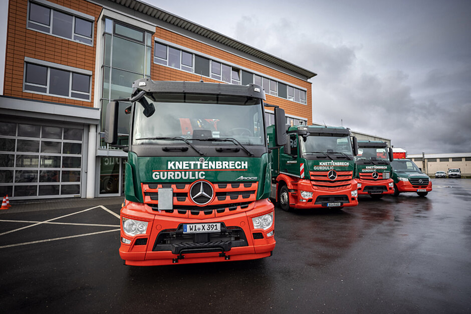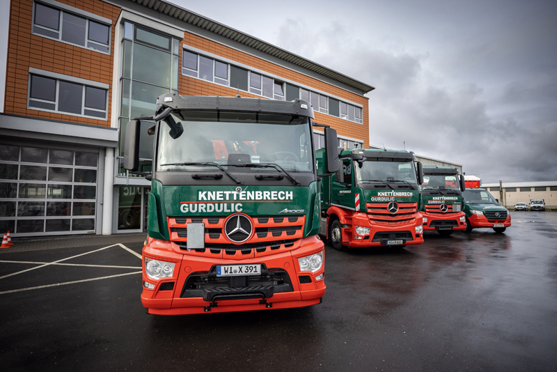 Knettenbrech + Gurdulic ist mit unterschiedlichsten Angeboten rund um Entsorgung und Recycling breit aufgestellt, entsprechend vielfältig ist die Bandbreite an Fahrzeugen und Konfigurationen. Für den Nah- und Fernverkehr sind Actros mit 290 kW bis 335 kW Leistung, Arocs (240 kW bis 265 kW) und Atego (175 kW) je nach Anforderung mit ClassicSpace-, BigSpace- oder GigaSpace-Kabine vorgesehen. Aufbauseitig umfasst die Bestellung vor allem Abfallsammelaufbauten sowie Absetz- und Abrollkipper. Aber auch Pritschen- und Kofferaufbauten gehören dazu.
