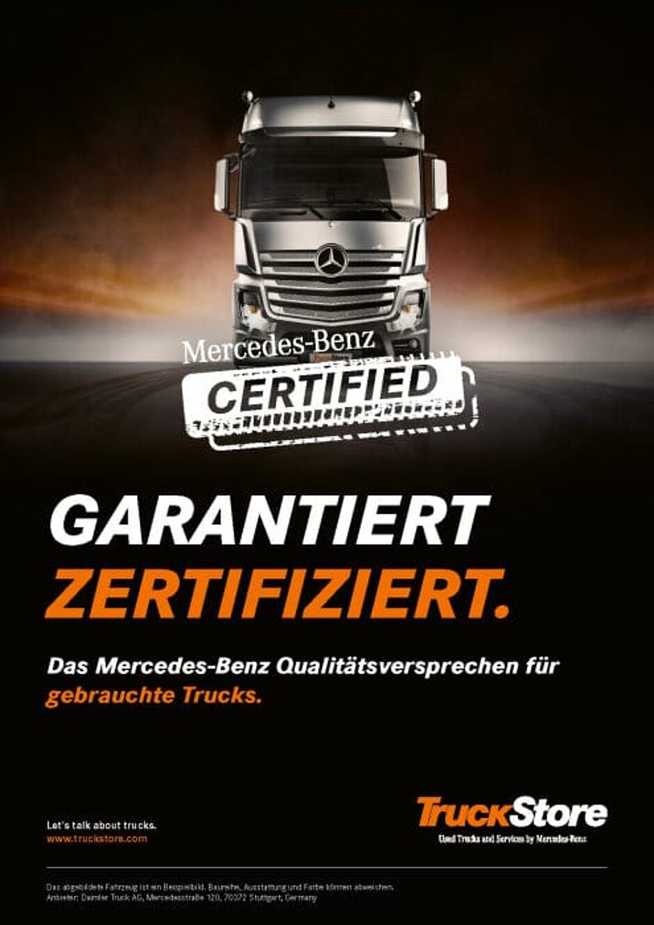 Das Label erhalten nur Lkw der Marke Mercedes-Benz, die höchstens fünf Jahre alt und maximal 500.000 Kilometer gelaufen sind. Die Mercedes-Benz Certified Urkunde bestätigt zudem, dass die ausgezeichneten Fahrzeuge mindestens drei Monate oder mindestens 20.000 (Lkw bis 12 Tonnen zulässigem Gesamtgewicht) beziehungsweise 30.000 Kilometer (Lkw ab 12 Tonnen zulässigem Gesamtgewicht) wartungsfrei fahren und in dieser Zeit auch keine gesetzlichen Prüfungen fällig sind. Alle zertifizierten Trucks verfügen zusätzlich über Reifen mit einer Profiltiefe von wenigstens sechs Millimetern. Fester Bestandteil des Qualitätsversprechens ist die Garantie von zwölf Monaten auf den Antriebsstrang. Diese gilt europaweit, ohne Laufleistungsbegrenzung und ohne Selbstbeteiligung. Für ausgewählte Modelle ist sogar eine Antriebsstrang-Garantie mit einer Laufzeit von 24 Monaten erhältlich.