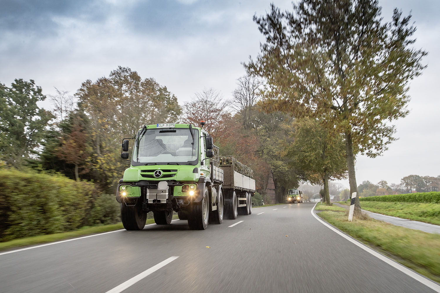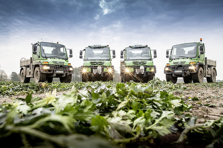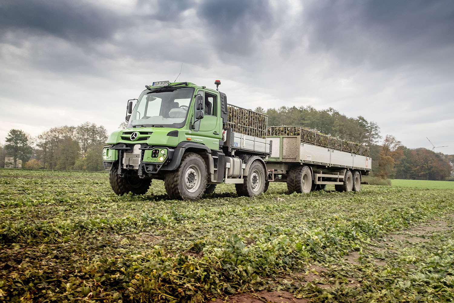 Eine zentrale Rolle im Betriebsablauf spielt die Logistik: Springender Punkt sind die täglichen Strecken, die die Fahrzeuge bewältigen müssen: bis zu 50 Kilometer kann die Entfernung zwischen Betriebsgelände und abzuerntendem Feld betragen – zu lang für einen klassischen Traktor. Der Agrarbetrieb hat sich deshalb schon vor langer Zeit für den Unimog entschieden. „Für die Fahrten vom Feld zum Betriebshof oder zum Erzeugergroßmarkt Langförden bei Vechta gibt es kein geeigneteres Fahrzeug als den Unimog“, so Werkstatt- und Fuhrparkleiter Marius Vaske. Seit 2008 kümmert er sich um das Wohl der Unimog auf dem Hof: Nach seinen Worten überzeugt der Unimog vor allem bei den Faktoren Schnelligkeit, Zuverlässigkeit, Spritverbrauch und Reifenabnutzung. „Kein anderes Fahrzeug kann uns effizienter dienen“. Deshalb wurden jüngst drei weitere Unimog U 427 angeschafft: es sind die Nummern zehn, elf und zwölf im Betrieb.