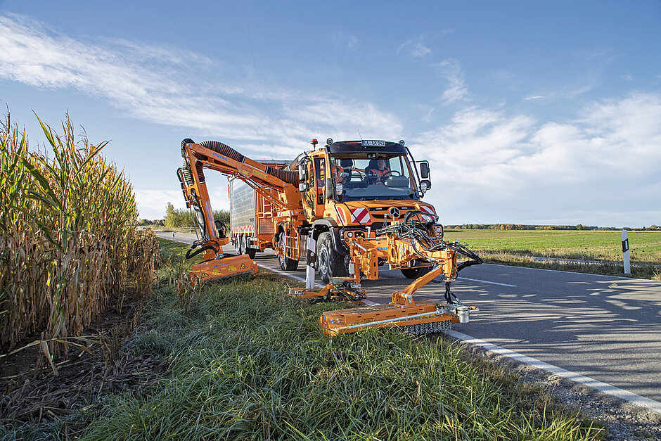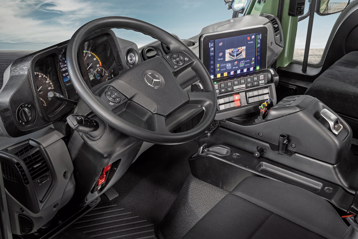 Mercedes-Benz Special Trucks zeigt erstmalig einen Unimog Geräteträger, der die Vorgaben der ab Juli in Kraft tretenden EU-Gesetzgebung zur Fahrzeugsicherheit (EU-Verordnung 2019/2144 General Safety Regulation II, kurz: GSR) erfüllt und dadurch mehr Unterstützung für den Fahrer und mehr Sicherheit für alle Verkehrsteilnehmer schaffen kann. Im Rahmen der neuen GSR sind jetzt unter anderem der Sideguard Assist, ein Frontguard Assist, ein Verkehrszeichen-Assistent, eine Rückfahrkamera und ein Warnsystem bei Reifendruckverlust serienmäßig verbaut. Fast alle der für den Unimog verfügbaren Anbaugeräte lassen sich künftig über das neue Bediensystem Uni-Touch steuern. Das neue Bediensystem kann geräteeigene Bedienpulte ersetzen und die Bedienung ergonomischer und intuitiver machen. Die Mittelkonsole ist umfassend überarbeitet, schlanker konzipiert und quer und längs verschiebbar. Die Anzahl der Bedienelemente konnte durch die Möglichkeit, Tasten individuell zu belegen und Anwendungsprofile sowie wiederkehrende Abläufe zu speichern, platzsparend reduziert werden. Über einen 10,5 Zoll großen Touchscreen kann der Anwender die passenden Einstellungen für den jeweiligen Arbeitseinsatz vornehmen. Für einen flexiblen Blickwinkel lässt sich der Bildschirm drehen und im Neigungsgrad verstellen.