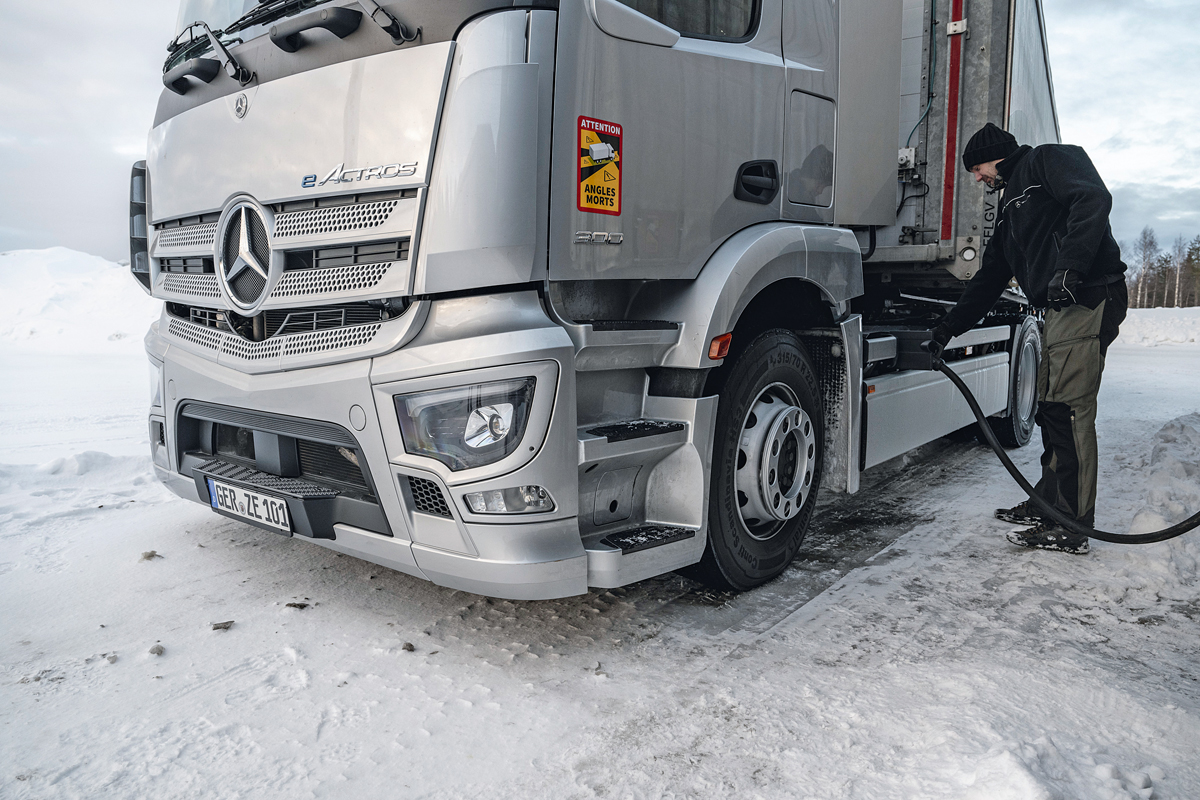 Mit dabei waren Fahrzeuge verschiedener Baureihen, darunter Prototypen des batterieelektrischen eActros LongHaul, dessen Serienreife für 2024 geplant ist, und des batterieelektrischen eActros 300 als Sattelzugmaschine sowie der konventionell mit Diesel angetriebene Actros L. Unter klimatischen Extrembedingungen wie beispielsweise auf verschneiter und vereister Fahrbahn, schneidendem Wind und Temperaturen bis zu minus 25 Grad testete das Entwickler- und Versuchsteam die einzelnen Modelle, um daraus Maßnahmen für weitere Optimierungen abzuleiten.