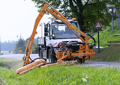 Der U 218 ist das kleinste Modell der Unimog-Baureihe. Seine Konzeption als Geräteträger und seine Autobahntauglichkeit machen den Unimog zu einem belastbaren wie dynamischen Einsatzfahrzeug. Besonders bei der Grünstreifenpflege, wenn Guy Gregson mit Hilfe des VarioPilot innerhalb einer Minute zwischen Links- und Rechtslenkung wechselt.