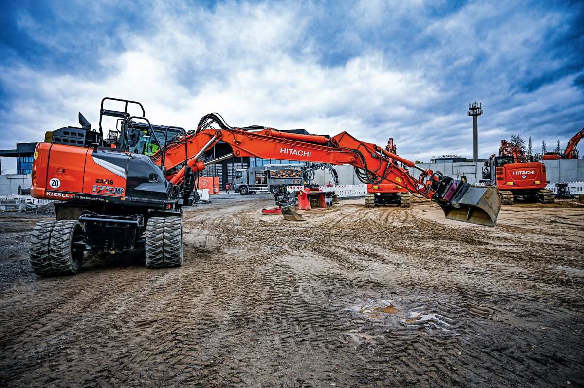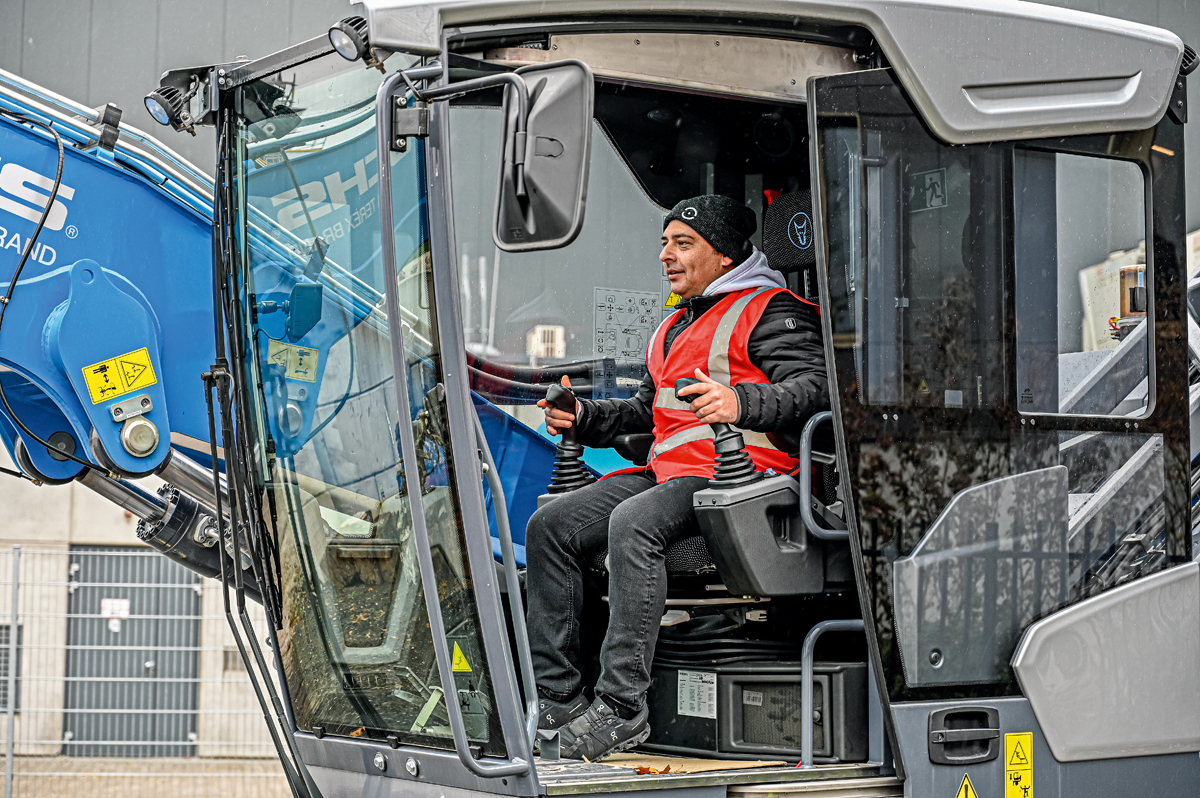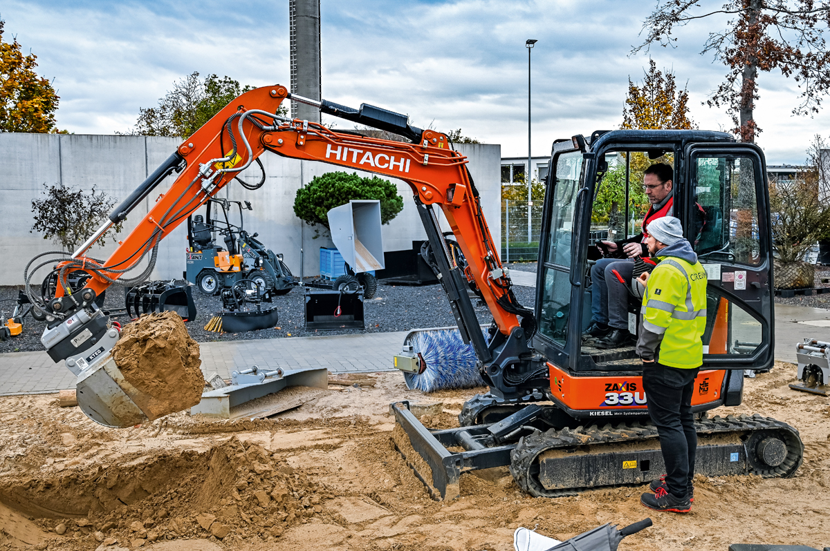Gespickt mit Videos, Bildern und einer durchdachten »Mitmach-App« sorgten die beiden Trainer für einen erstaunlich lebendigen Theorieteil: Angefangen damit, was Kompaktlader, Mobilbagger, Abbruchgeräte, Umschlagsmaschinen oder Radlader alles leisten können, zielte die theoretische Einführung auch darauf ab zu zeigen, wie man es »eben nicht« machen sollte. »Uns geht es nicht darum zu belehren, sondern zu unterstützen: Aus der Vergangenheit wissen wir, dass selbst ein Baggerfahrer mit 20-jähriger Erfahrung nicht zwangsläufig alles richtig macht«, so Markus Stegmüller. »Wir haben es mit tonnenschwerem Gerät zu tun, weshalb ein sicherer und effizienter Umgang damit unerlässlich ist.« Erstaunlich ist, wie schnell es tatsächlich zu Unfällen kommt. Mithilfe von teils dramatischen Videobeispielen zeigten die beiden Trainer, warum das Bedienen riesiger Radlader gerade im Rückwärtsgang höchste Konzentration abverlangt und was es bei tonnenschweren Abbruchbaggern zu beachten gilt, damit auch wirklich nur das Haus und nicht der Bagger unter Schutt begraben wird. Alles in allem verpackten Markus Stegmüller und Thorsten Merz-Mantwill wichtige theoretische Lerninhalte in eine praxisnahe Hülle mit Anwendungsbeispielen und eigenen Erfahrungswerten. Angefüttert wurde das Ganze dann noch mit einer unterhaltsamen »Mitrate«-App, bei der die Teilnehmer unter Zeitdruck richtige Antworten über ihr Smartphone liefern mussten – der Gewinner erhielt am Ende eine Überraschungsgeschenk.«