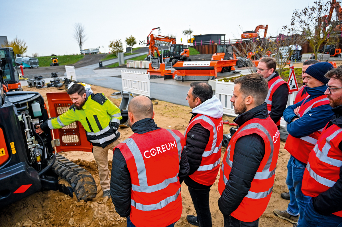 Die erfahrenen Akademie-Trainer Markus Stegmüller und Thorsten Merz-Mantwill hatten im Vorfeld ein Trainingsprogramm ausgearbeitet, das sowohl dem unerfahrenen Nachwuchs als auch alteingesessenen »Baggerhasen« gerecht wurde. »Das offene Training zielt darauf ab, ein individuell zugeschnittenes Programm zu bieten«, so Markus Stegmüller, der das in erster Linie von den Erfahrungswerten seiner Teilnehmer abhängig macht. »Gleichzeitig hat das Training zum Zie, den Umgang mit der Maschine weiter zu verbessern, neue Systeme kennenzulernen und sich fit für die Zukunft zu machen«, ergänzte Thorsten Merz-Mantwill, der in diesem Zusammenhang auch auf Trainings für Technikliebhaber aufmerksam machte. Die Coreum-Akademie bietet abseits der Anwendertrainings auch Technik-Varianten an, die auf Antriebe, Elektrik, Motoren und Hydraulik abzielen, um die vorhandenen Diagnose- und Wartungsfähigkeiten weiter zu schärfen. »Der große Vorteil im Coreum ist der direkte Draht zur Praxis: Bloße Theorie findet bei uns nicht statt – sie ist gezielt anwendernah integriert und sorgt dafür, dass ein guter Mix entsteht«, sagte Markus Stegmüller, was er am ersten Tag unseres Trainings auch prompt unter Beweis stellte.