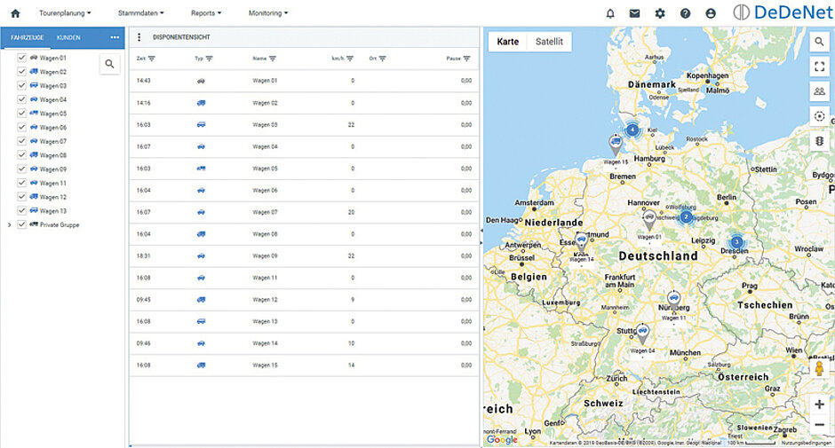 Weil die intuitive Bedienbarkeit bei allen Lösungen von DeDeNet im Vordergrund stehe, habe die Web-Oberfläche nach Angaben des Anbieters ein rundum erneuertes Design erhalten, das dem Benutzer in der Hauptansicht eine übersichtlichere und zugleich umfassendere Darstellung biete. In der Disponentenansicht lassen sich demnach die Fahrzeuge leicht in selbst definierten Gruppen organisieren, sodass jederzeit der konkrete Informationsbedarf erfüllt wird. Gleichzeitig werden in der Kartendarstellung bei niedrigen Zoom-Stufen die angezeigten Fahrzeuge und Kunden zu Clustern zusammengefasst, damit der Disponent Bestand und Aufträge einfacher im Blick behält. Auch eine individuelle Filterfunktion ist in jedem Modul der Software enthalten.