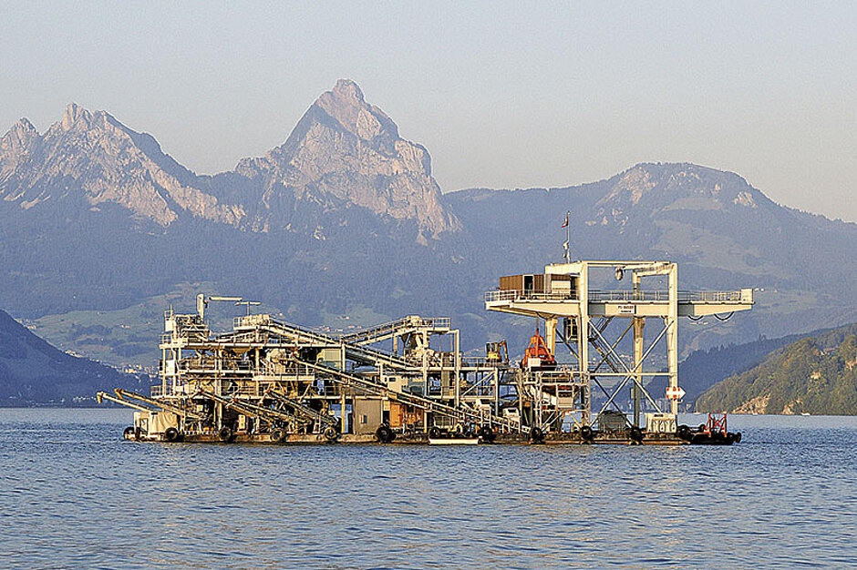 Auf dem Vierwaldstättersee in der Schweiz schwimmt dieser »Europameister«. Es ist eine Schwimmbaggeranlage mit einem Kröger-Seil-Unterwassergreifer vom Typ UWS. Mit diesem Gerät sollen sich selbst unter schwierigsten Bedingungen Kies und Sand unter Wasser gewinnen lassen. Hier hob ein 8-m³-Greifer von Kröger einen 26 t schweren Felsbrocken aus 180 m Wassertiefe ans Tageslicht – dies entspricht dem Gewicht von rund 22 VW-Golf. Der Kröger-Greifer bestand die Gewaltleistung ohne Beschädigung.