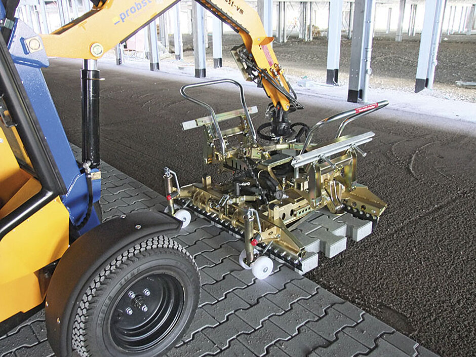 Die Verlegemaschine ist ein Teil der maschinellen Pflasterverlegung. Doch der »Helfer in der Not« war durchaus die hydraulische Verlegezange HVZ-UNI-II. Auf der Baustelle wurde nur eine Verlegemaschine samt Zange verwendet. Für diese Fläche und bei täglich durchgehendem Einsatz war das ausreichend und effizient. Dennoch war bei der Verlegearbeit Schnelligkeit und präzise Arbeit gefragt. Die neue Probst-Verlegezange ist universell geeignet zur Verlegung aller marktüblichen Verbundsteineinheiten. Leicht lassen sich auch schwere Steinlagen verlegen und durch die hohe Spannkraft gibt es auch kein »Durchhängen« der Steinlagen mehr. Die Hauptspannung lässt sich über eine Spindel einstellen. Die Verlegezange hängt auch bei schnellen Fahrbewegungen ruhig, schwingt wenig nach und erlaubt daher eine zügige Verlegung.