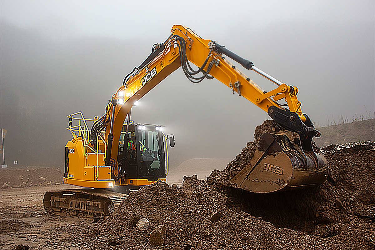 Mit der Präsentation war das so eine Sache: Die schwarz-gelben Baumaschinen ließen sich ob dicker Nebelschwaden kaum ausmachen, während gelbes Scheinwerferlicht versuchte, sich durch den dichten Wasserdampf hindurchzuzwängen. Richard Brooks, Leiter der Abteilung Materialwirtschaft und Zugangstechnik bei JCB, wusste das Wetterproblem aber in typisch britischer Manier mit einem Lächeln zu umschiffen: »Wir haben Glück mit dem Wetter – immerhin regnet es nicht!«