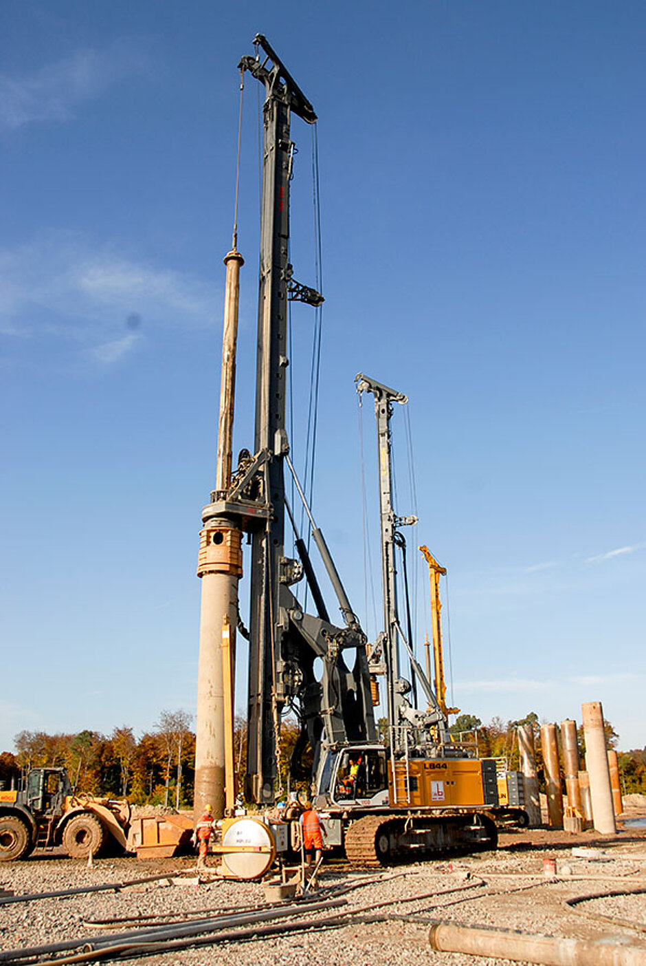 Insgesamt wurden seit März 2013 rund 1 400 Gründungspfähle mit einer Länge von 40 m bis zu 62 m und einem Durchmesser von 1,2 m in den Boden gesetzt, um so die hauptsächlich sandigen und aus Ton bestehenden Böden des Baugrundes zu stabilisieren und ein tragfähiges Fundament zu schaffen. Diese Arbeiten übernehmen auch zwei Großdrehbohrgräte vom Typ LB 44-150, die erstmals auf der Bauma präsentierte neueste Entwicklung aus dem Liebherr-Produktbereich Spezialtiefbau. Das LB 44-510 ist mit einem Drehmoment von 510 kNm das größte und leistungsstärkste derzeit in Deutschland eingesetzte Großdrehbohrgerät. Im Kellybohreinsatz ist es für Bohrdurchmesser von bis zu 3 m und Bohrtiefen von maximal 92 m ausgelegt. Bewegt wird das rund 170 t schwere Spezialtiefbaugerät von einem V8-Dieselmotor mit 505 kW (687 PS) Antriebsleistung, der dem Emissionsstandard nach Abgasstufe IIIB/Tier 4i entspricht.