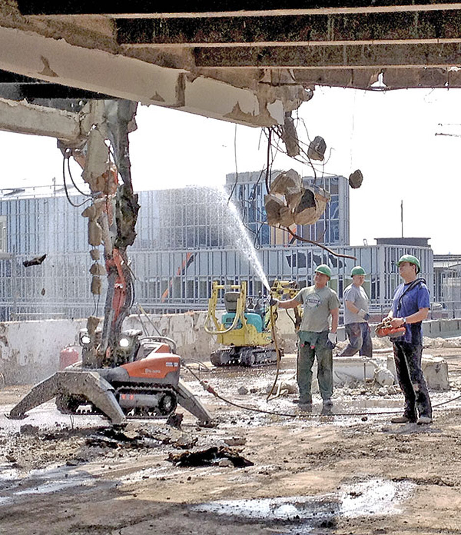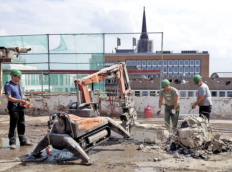 Weil der DXR 140 »so wunderbar funktioniert hat«, so Pawlowski, ist seit Ende Juni bei der Entkernung der unteren Geschosse des »Stadthauses« mit dem ebenfalls bei Manske PSM angemieteten DXR 310 der derzeit stärkste Abbruchroboter von Husqvarna im Einsatz. »Nach den ausgezeichneten Erfahrungen, die wir mit dem DXR 140 gemacht haben«, sagt Pawlowski, »stand es für mich außer Frage, auch bei den folgenden Abbrucharbeiten am ›Stadthaus‹ wieder auf einen Husqvarna-Roboter zu setzen.«