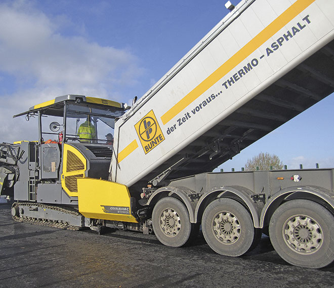 Der Asphalteinbau unter Einsatz eines Beschickers gilt als eine der effizientesten Methoden der Qualitätssicherung im Asphaltstraßenbau. Auch in diese Technologie wurde bei Bunte erneut investiert. Ein zusätzlicher Beschicker MF300C des Herstellers Dynapac aus dem Hause Atlas-Copco vergrößert den Gerätebestand auf nunmehr drei Übergabegeräte.