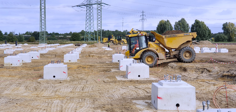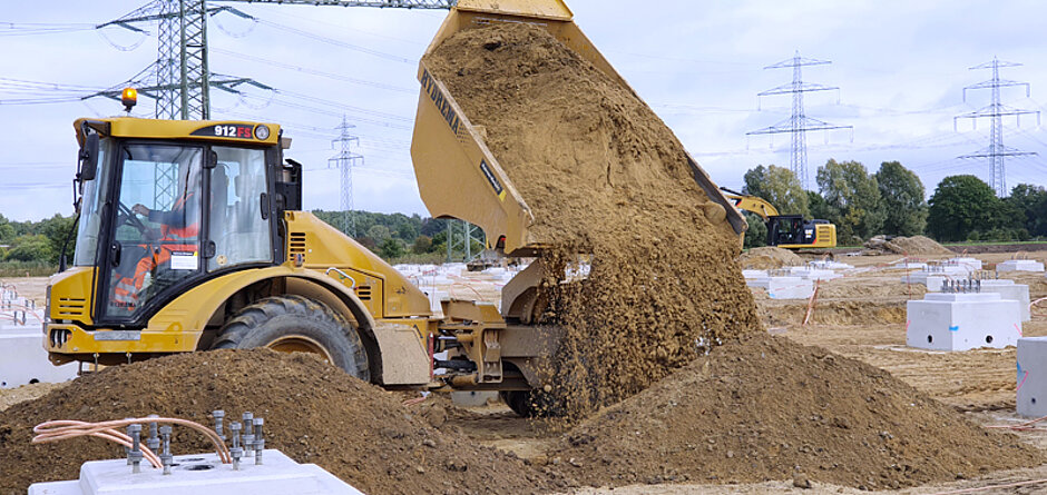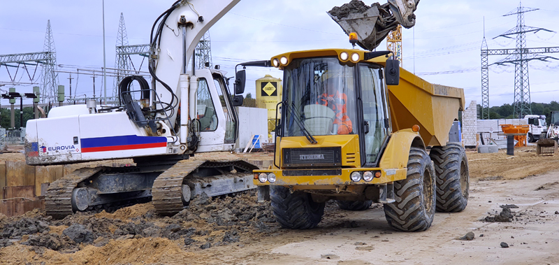 Das Umspannwerk Hamburg Ost wird umgebaut und erweitert um den steigenden Anforderungen für die Stromversorgung auch in Zukunft gerecht werden zu können. Auf einer mehr als 100.000 m² großen Baustelle in unmittelbarer Nähe zum Autobahnkreuz Hamburg-Ost werden dafür seit März 2020 durch das Großunternehmen EUROVIA die entsprechenden Erdbaumaßnahmen ausgeführt. Projektleiter Christoph Grenzdörfer von EUROVIA kann sich noch sehr genau an die Arbeiten rund um das ursprüngliche Areal erinnern: „Der Boden hier oben im Norden ist teilweise sehr weich und extrem unwegsam gewesen. Wenn wir nicht die Dumper von HYDREMA gehabt hätten, hätten wir nicht gewusst, wie wir das Material wirtschaftlich hätten herausbekommen können“. Zwei Dumper vom Typ 912 FS befinden sich dort im Einsatz und fahren das alte Material über eine lange Baustraße zum Zwischendepot, aber auch das neue Material zwischen den eng besetzten Grundpfeilern zum Einarbeiten ein.
