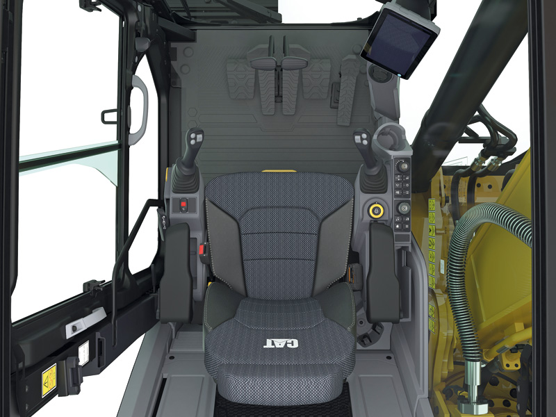 Die Kabine verfügt über große Vorder-, Rück- und Seitenfenster, um die Sichtverhältnisse nach vorne und seitlich zu verbessern. Die optionale 360°-Umsichtfunktion fügt Bilder von mehreren an der Maschine montierten Kameras zusammen, um die Sicht des Fahrers in alle Richtungen zu gewährleisten. Die Klimaautomatik hält die Temperatureinstellungen unabhängig von den Umgebungstemperaturen ein. Mit dem integrierten Bluetooth-Radio mit USB-Port zum Anschließen und Aufladen von Smartphones kommunizieren die Fahrer via Freisprecheinrichtung.