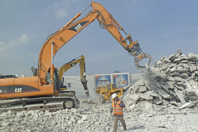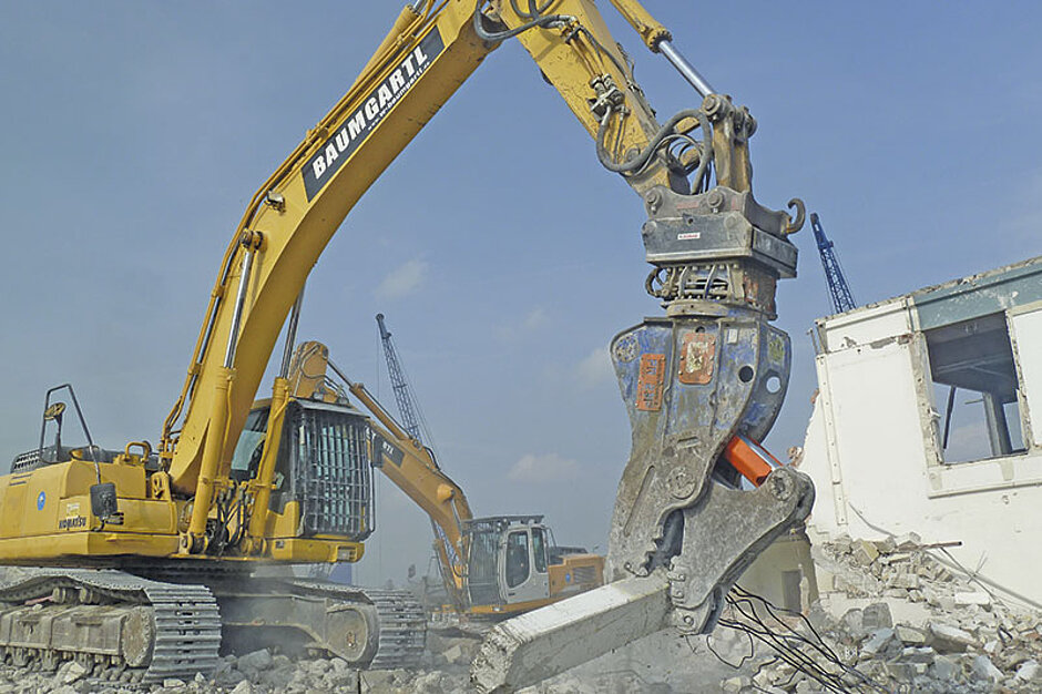 Damit der Rückbau nicht nur kontrolliert und schnell, sondern auch effizient durchgeführt werden konnte, wurde das nahezu komplette Abbruchanbauwerkzeugeportfolio eingesetzt: Indeco-Hydraulikhämmer (Aufbruch Kellerfundament), Trevi-Abbruchzangen (armierter Beton und Materialien in bestimmten Arbeitshöhen), Multifunktionszangen (Universalbrecher und Pulverisierer) und ein hydraulisch betriebener Elekromagnet mit fünf Reißzähnen (Vor-Ort-Sortierung von Schrott, Eisen und Stahl).