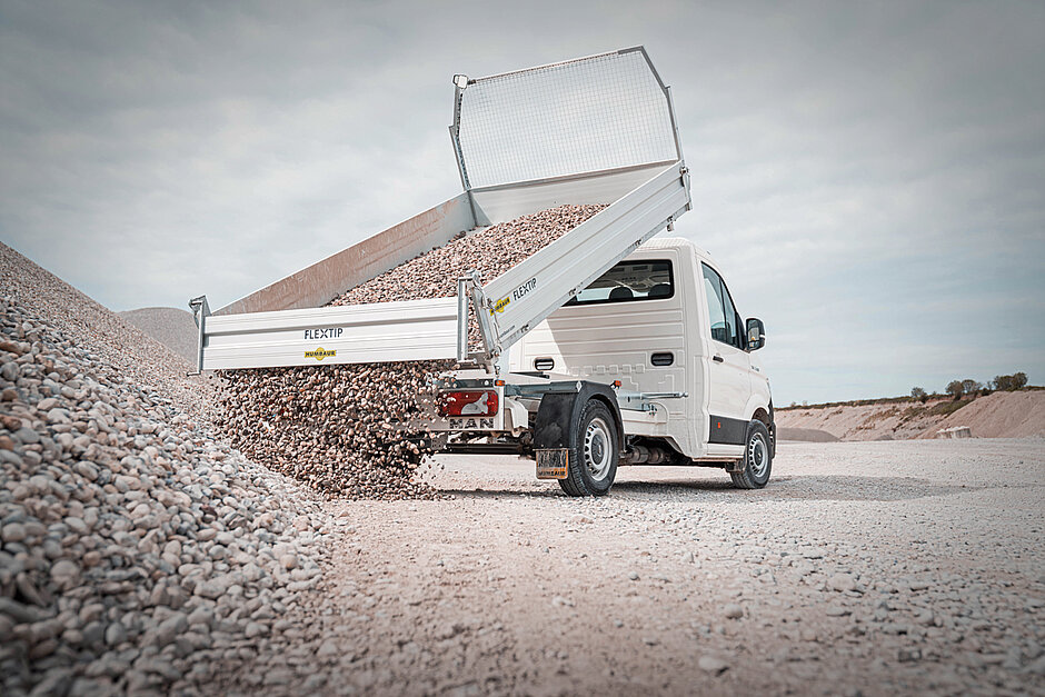 Der Dreiseitenkipper-Aufbau FlexTip ist laut Humbaur nicht nur robust gebaut, sondern bietet zugleich auch größte Flexibilität. Aufgrund der Dreiseiten-Kippfunktion und des Kippwinkels von 45° lässt er sich schnell beladen und ist durch die Flexibilität in Länge, Breite und Höhe für verschiedene Fahrzeugmodelle und Einsatzzwecke verfügbar. Das Brückenblech und der Rahmen sind vollständig feuerverzinkt und somit optimal vor Rost und Korrosion geschützt. Die elektrische Kippfunktion lässt sich bequem per App steuern und serienmäßig sorgen Arbeitsscheinwerfer für gute Sicht. Acht versenkbare Zurrpunkte sowie die Airlineschiene am Stahlgitteraufsatz ermöglicht eine optimale Ladungssicherung. Serienmäßig ist ab sofort auch eine neue Fernbedienung im überarbeiteten Design enthalten. Diese muss nicht mehr an das Fahrzeug angeschlossen werden, sondern kann bequem vom Innenraum des Fahrerhauses bedient werden. Als zusätzliches Feature können vier Tasten frei programmiert werden.